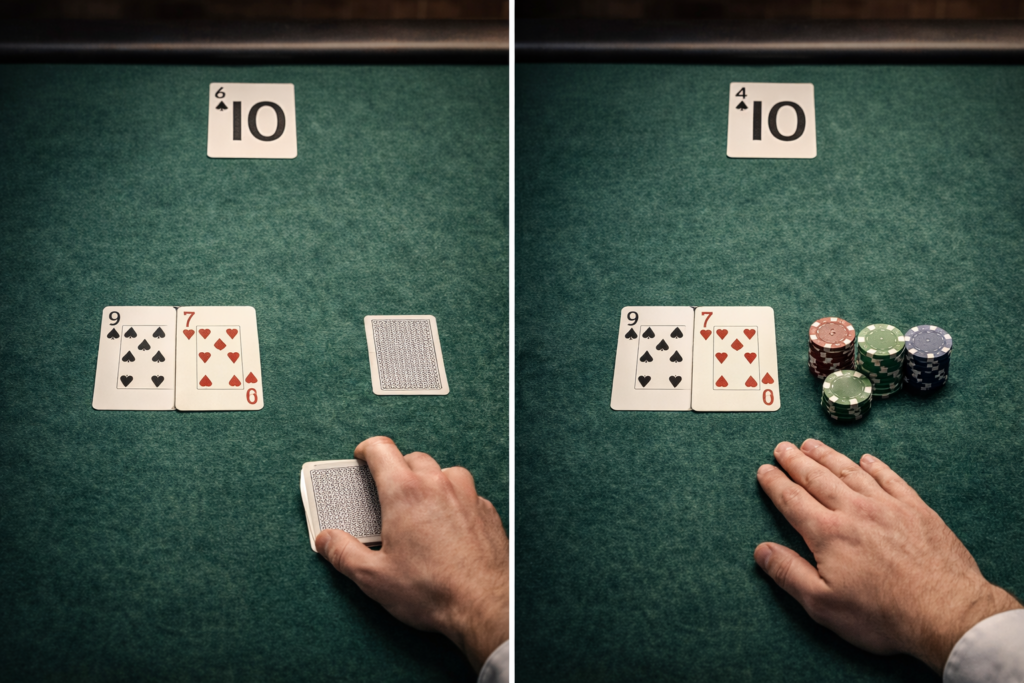 I tu se krije problem. U blackjacku ponekad nema dobrog izbora, ima samo izbor koji je manje loš. Ruka 16 protiv dilerove 10 je upravo to: scenario u kojem često gubiš bez obzira na potez, ali jedan potez gubi manje na duže staze.